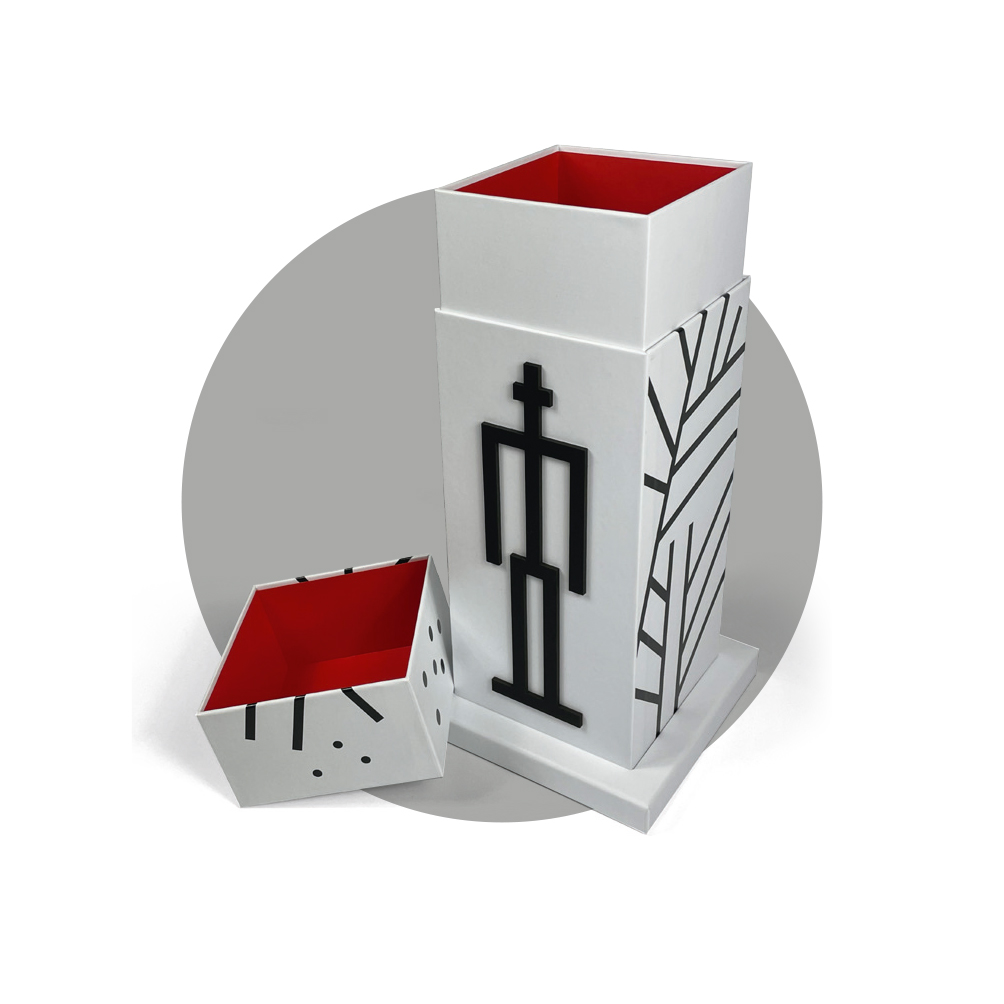 Один или несколько лотков на жесткой картонной обложке. Для переноски используются веревочные, ленточные или пластиковые ручки.