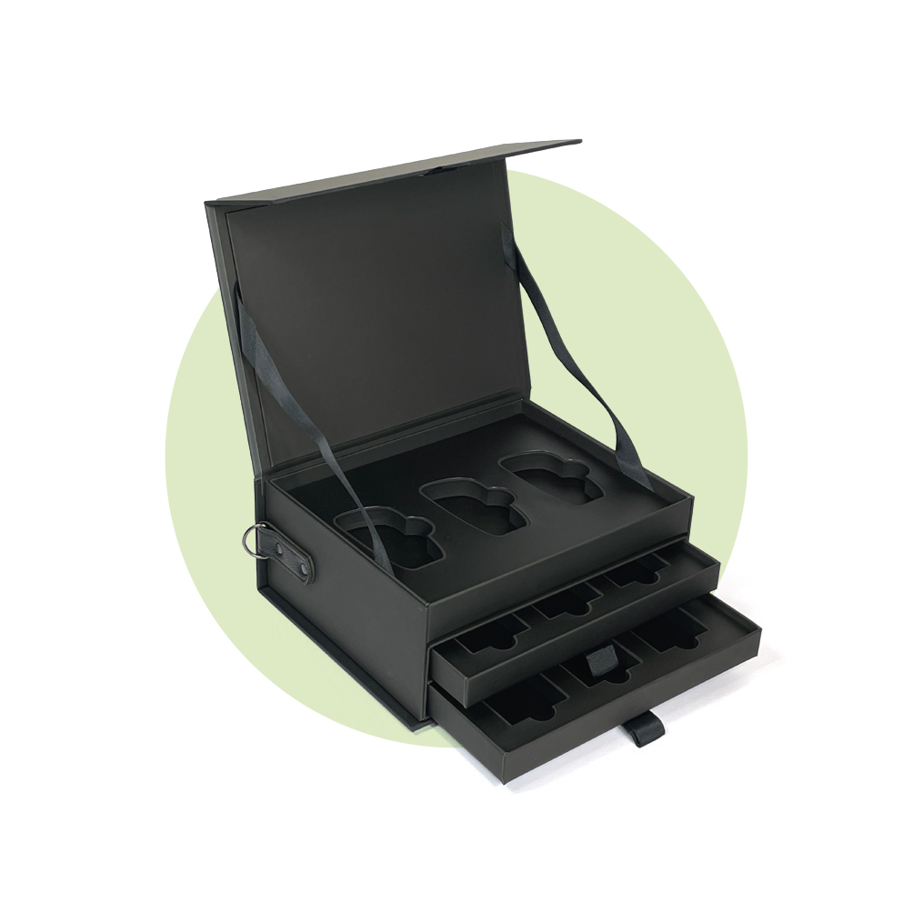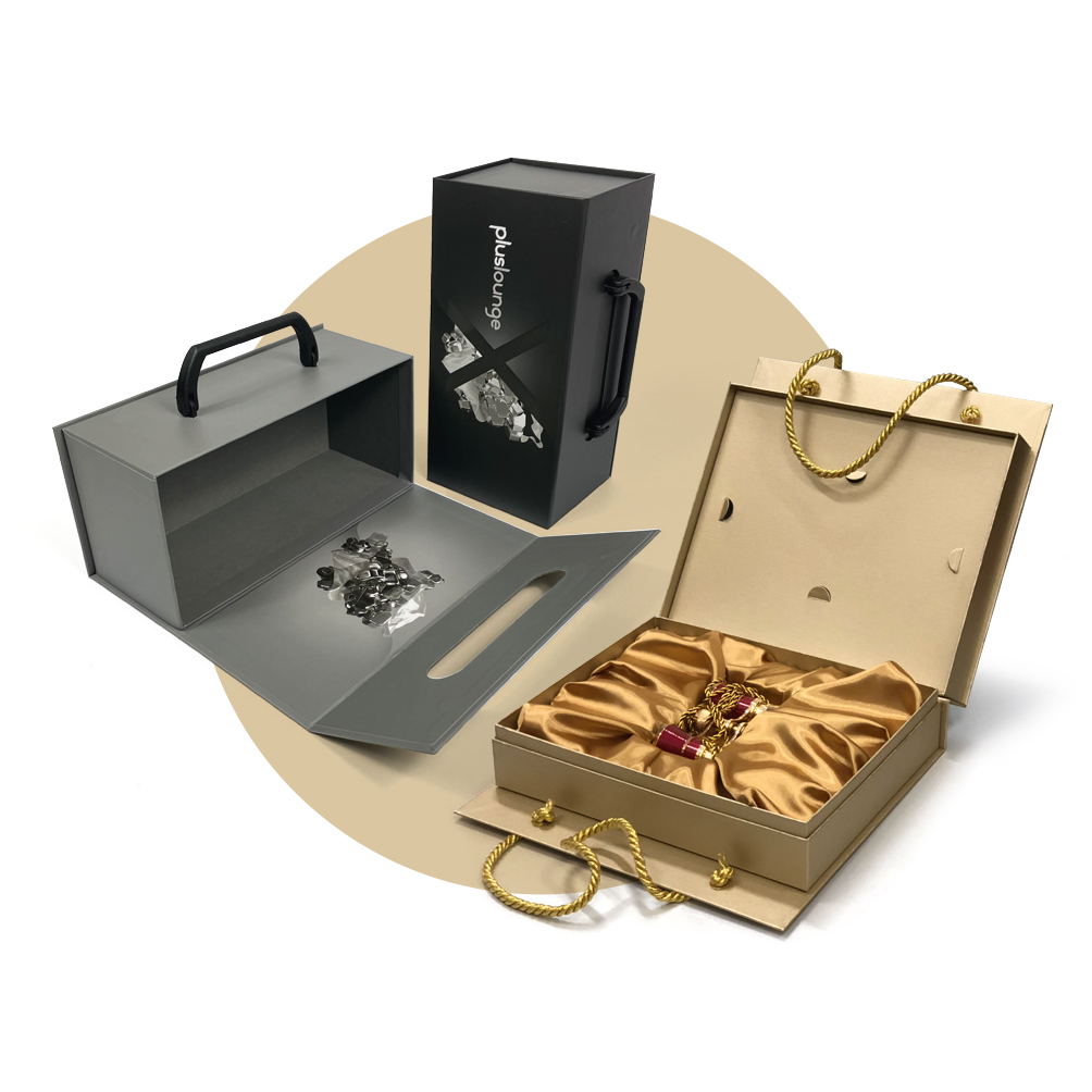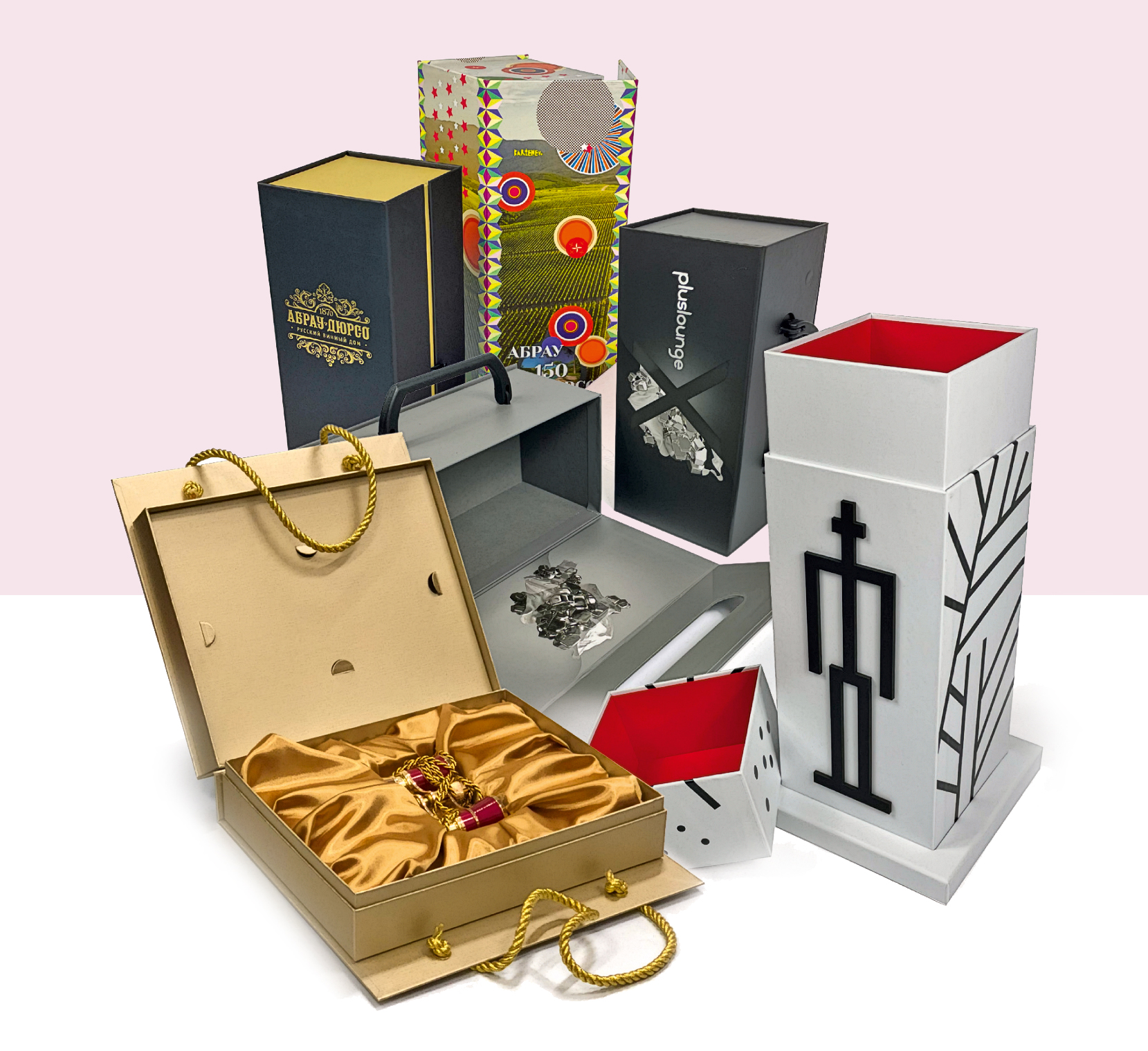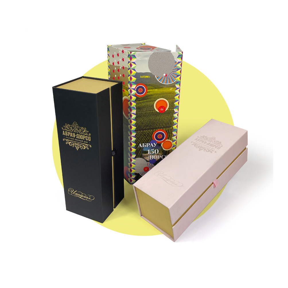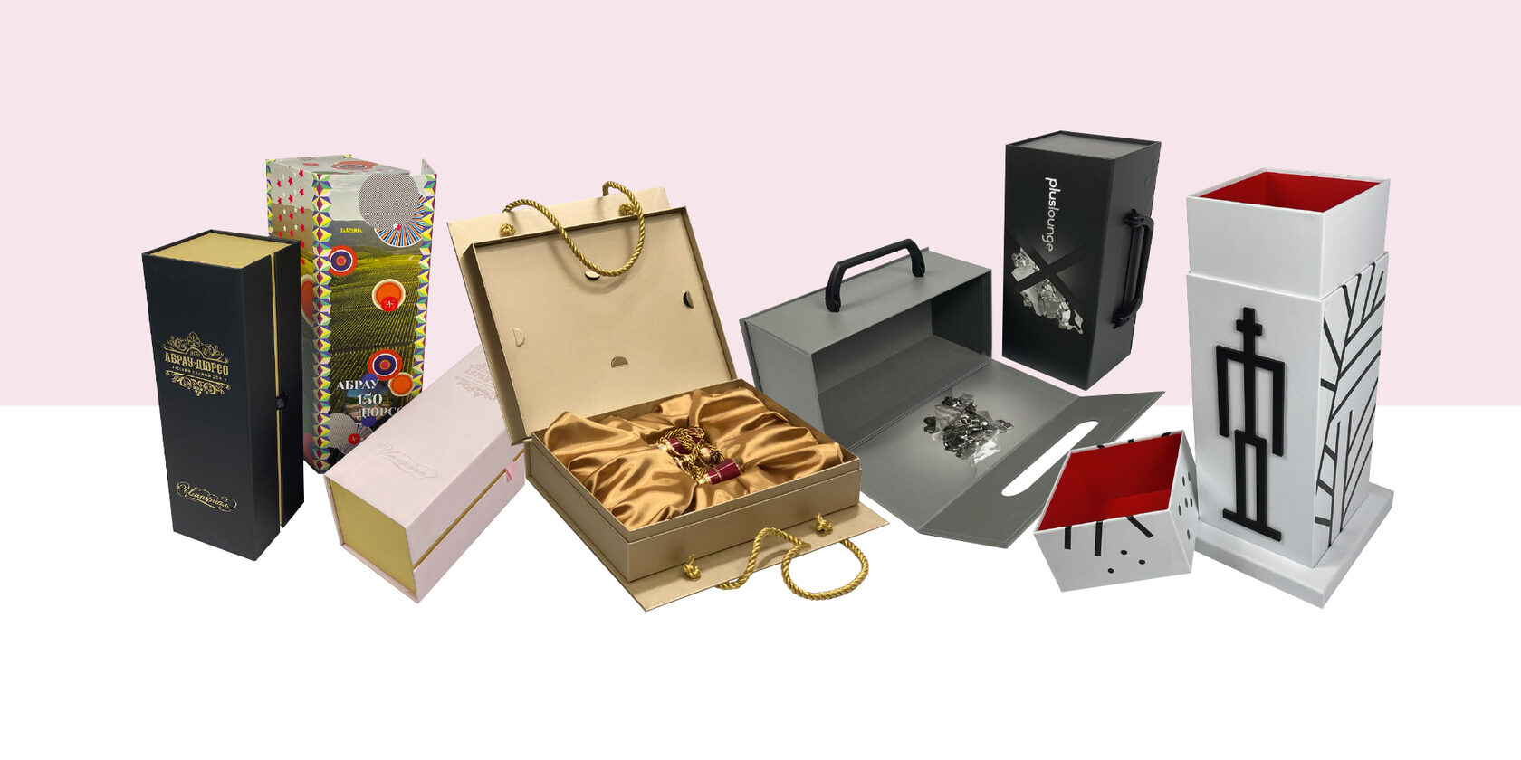 Вертикальные коробки с магнитным клапаном. Широко используются различные ложементы для фиксации бутылок и возможных дополнительных вложений.