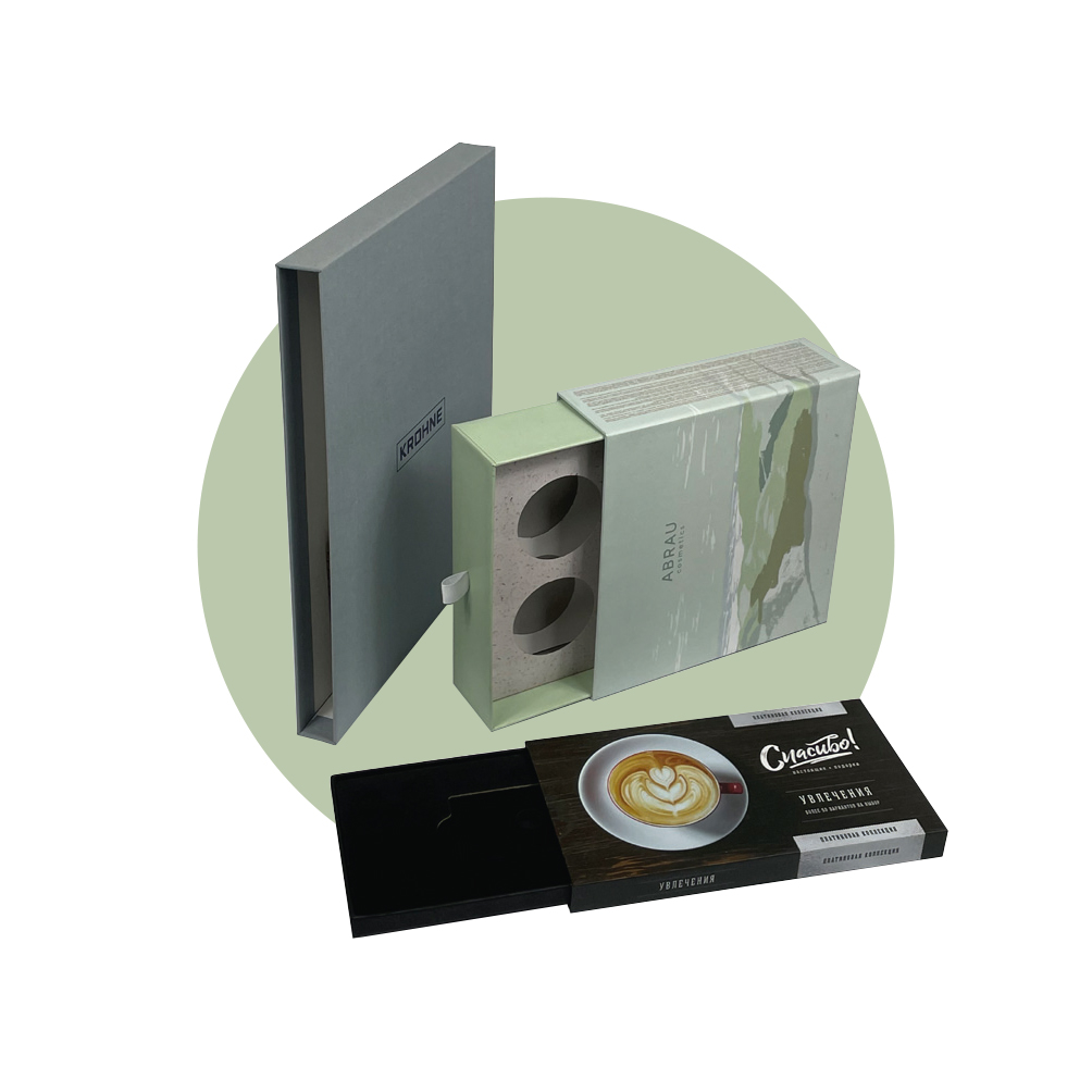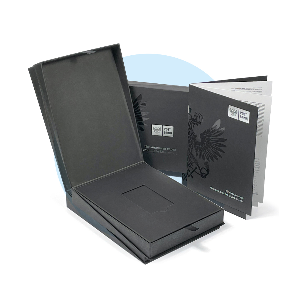 Различные по конструкции коробки с ложементами для пластиковых карт и отсеками для дополнительных вложений.
